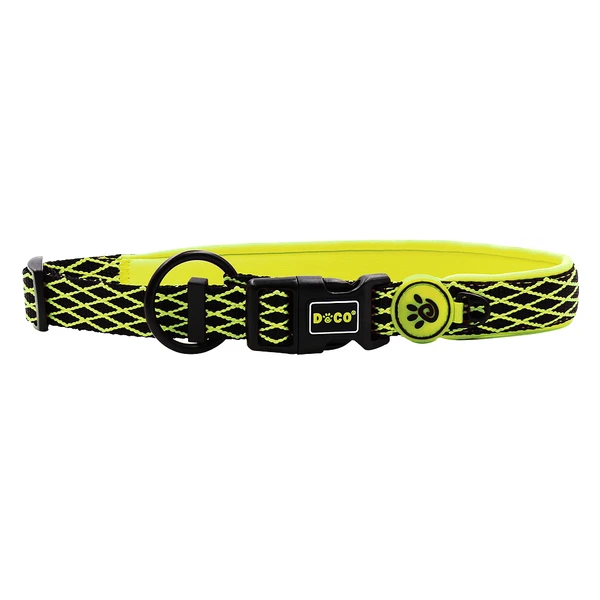 Special Features 100% high quality single-ply nylon Comfortable neoprene backing Nylon is resistance to mildew, aging and abrasion Quick & easy release plastic buckle Tri-glide for easy size adjustment Heavy duty O-Ring for leash and ID tag Vibrant colors are easy to see at all times