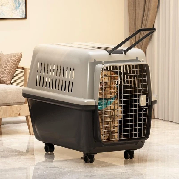 Portable Pet Travel Carrier Metal Door with Wheels (100*62*72cm) - Beige/Brown